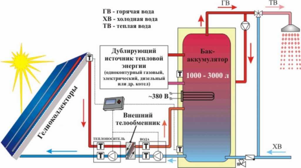 Специалисты рекомендуют использовать для этой цели стандартный накопительный бак для системы горячего водоснабжения или, как альтернативный вариант, — буферную емкость из автономной отопительной системы. Грамотно построенная конструкция подразумевает соединение коллектора с дополнительным теплообменником, который напрямую контактирует с накопительным баком. Существует пять проверенных на практике схем подключения оборудования.