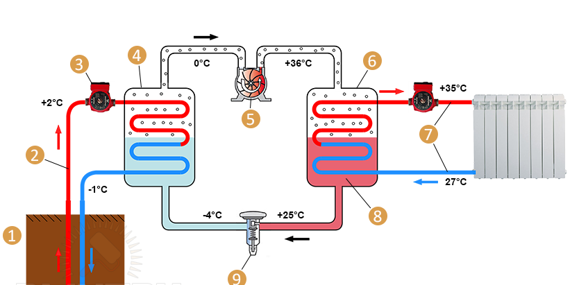 Перемещаясь в компрессор, хладагент (чаще всего фреон) подвергается действию высокого давления и сжимается, из-за чего его температура повышается. Разогретый давлением газ поступает в другую часть теплообменника – в конденсатор. Тут промежуточный теплообменник передаёт тепло теплоносителю, который входит в систему отопления дома. Во время того, как хладагент отдает тепло, он конденсируется, снова становится жидким, а нагретый им теплоноситель подаётся в систему отопления. Жидкий фреон проходит через расширитель, где вскипает поглощая тепло. Затем перемещается в испаритель, где докипают остатки жидкой фракции – и цикл повторяется снова.