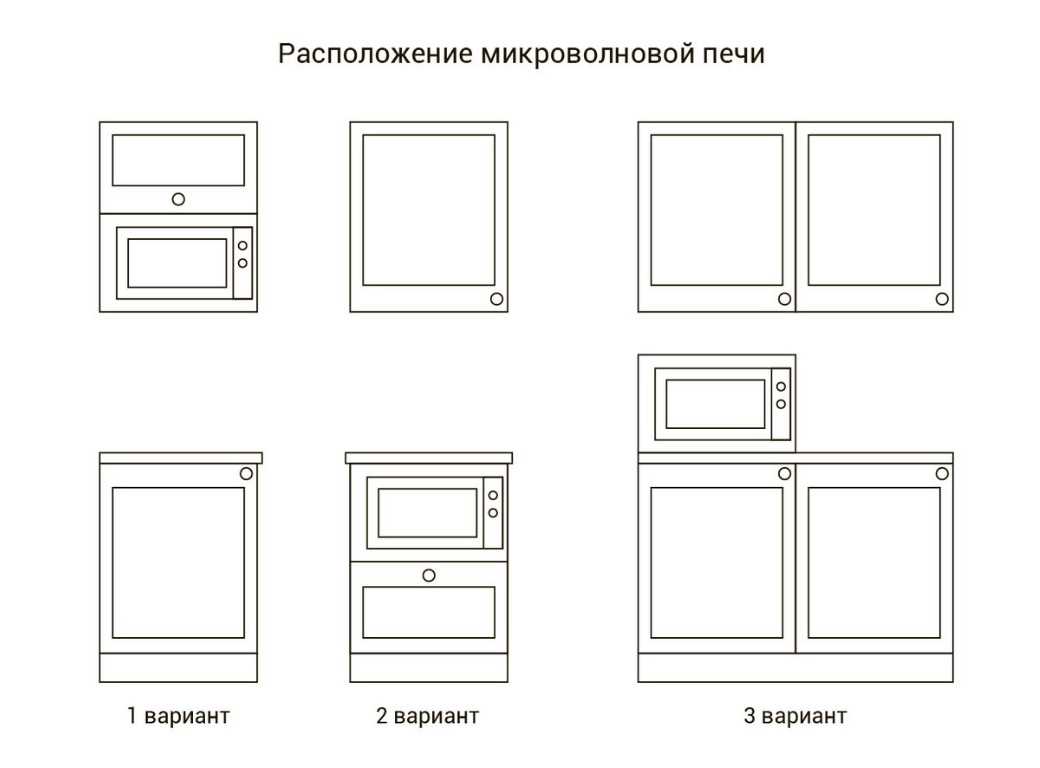 Микроволновые печи в основном размещают непосредственно на рабочей поверхности. Это делает СВЧ доступной, но «крадет» много поверхности и снижает функциональность кузни. Вы удивитесь, но вариантов размещения СВЧ существует множество, в том числе встраиваемые в кухонный гарнитур. С наиболее популярными вариантами предлагаем вас познакомиться на приведенных примерах.