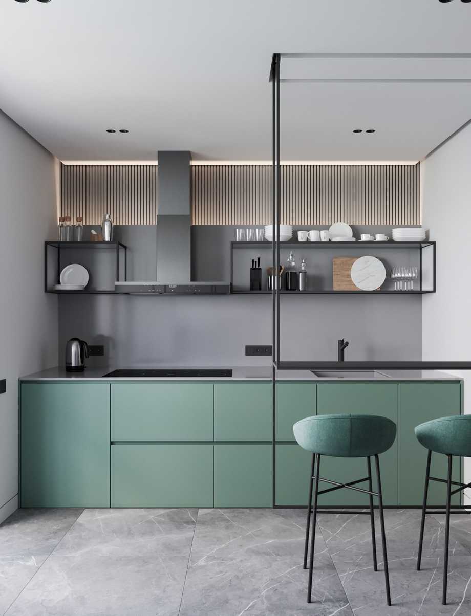 - Минимальная ширина проходов на кухне должна составлять около 120 см. В такой «пешеходной зоне» домочадцы смогут перемещаться, не мешая кулинару готовить, доставать продукты из шкафчиков и холодильника, загружать посудомойку. Если кухня проходная, как это часто бывает в частных домах, то проход стоит увеличить до 130-150 см. В очень маленьких и непроходных кухнях допустимы 1-метровые проходы.