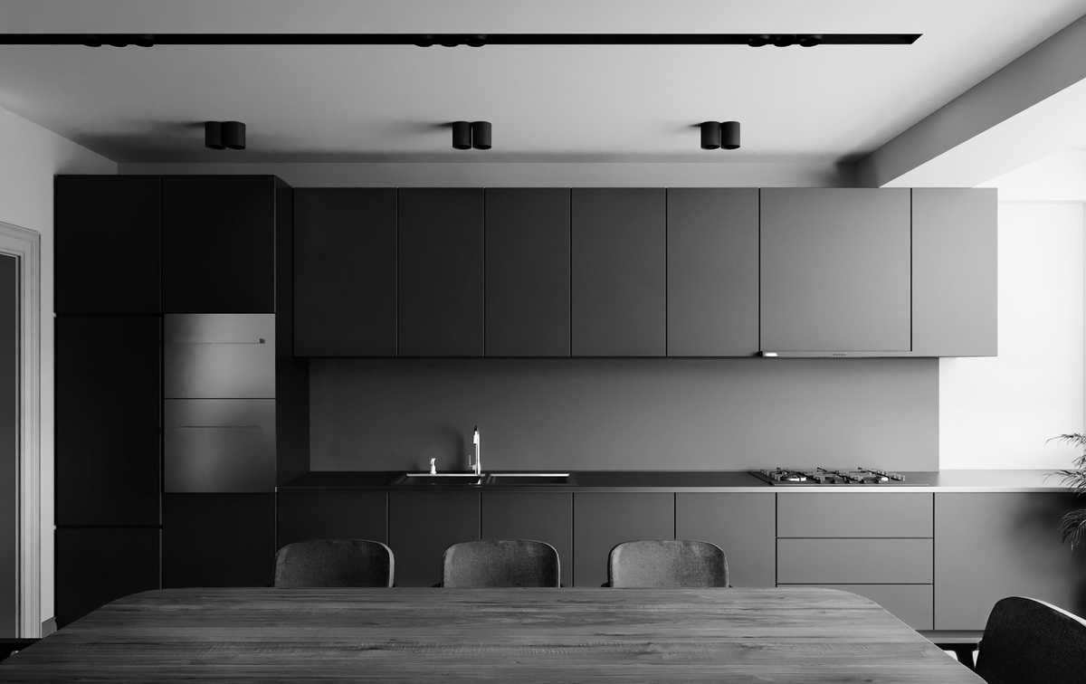 Находясь между двумя параллельными кухонными конструкциями, есть возможность комфортно и без лишних движений работать на кухне.