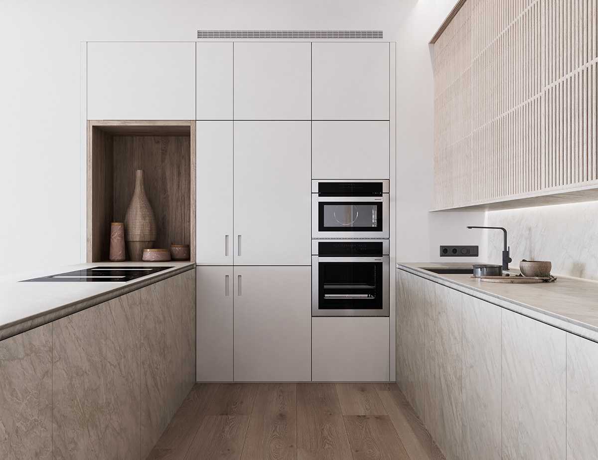 П-образная кухня: мебель располагается в виде буквы «П» вдоль трех стен. Мойка располагается в среднем ряду, а плита и холодильник — в противоположных секциях, ширина прохода между которыми должна быть в пределах 120 — 280 см.