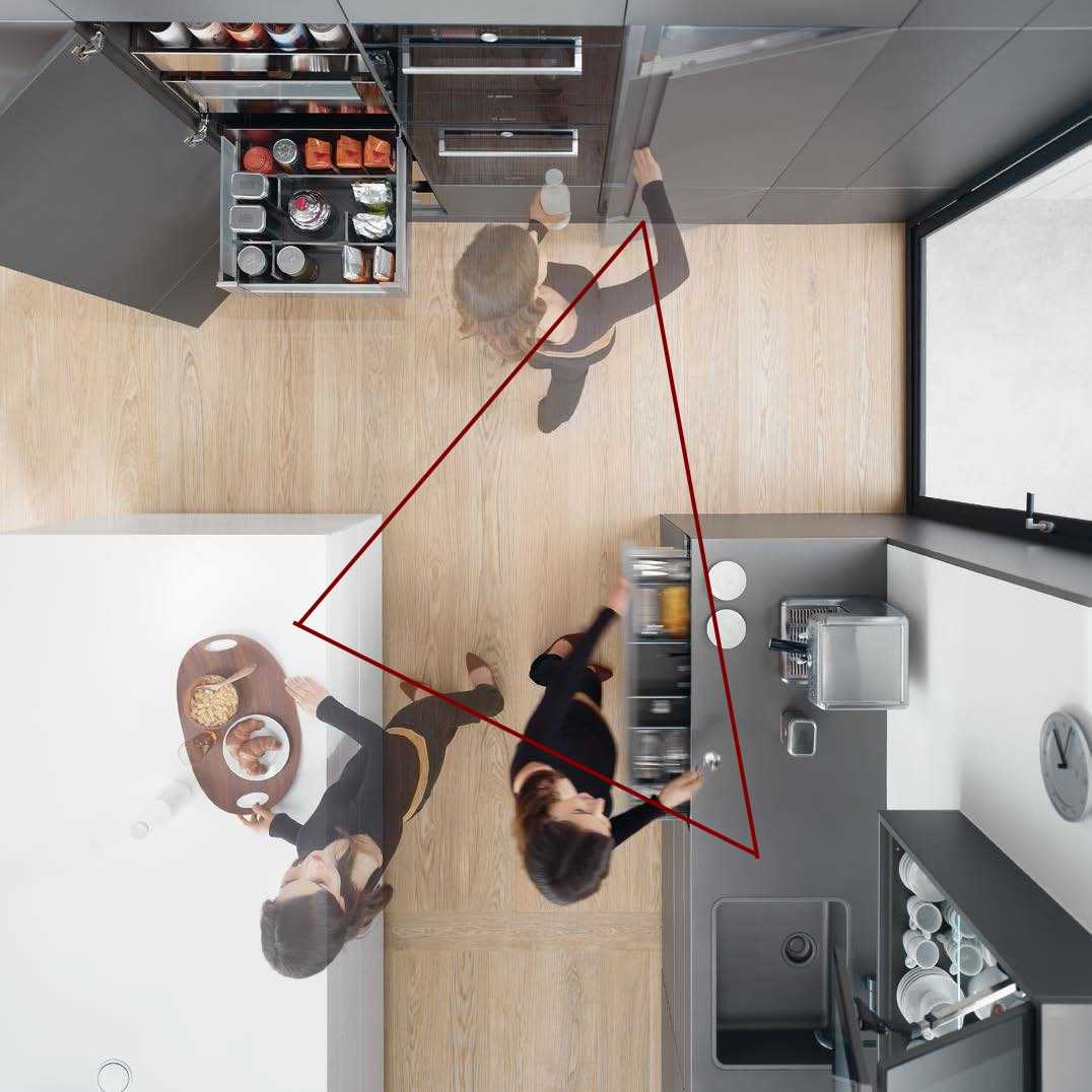 Оптимально площадь рабочего треугольника должна составлять не более 5–7 квадратных метров (иначе приготовление ужина рискует превратиться в забег на длинную дистанцию).
