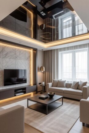 - ПВХ-потолки. Изготавливаются из поливинилхлоридной плёнки, отличаются разнообразием текстур (глянцевые, матовые, сатиновые) и цветов. Глянцевые поверхности визуально увеличивают пространство за счёт зеркального эффекта, матовые создают спокойный фон, а сатиновые имеют мягкий блеск.