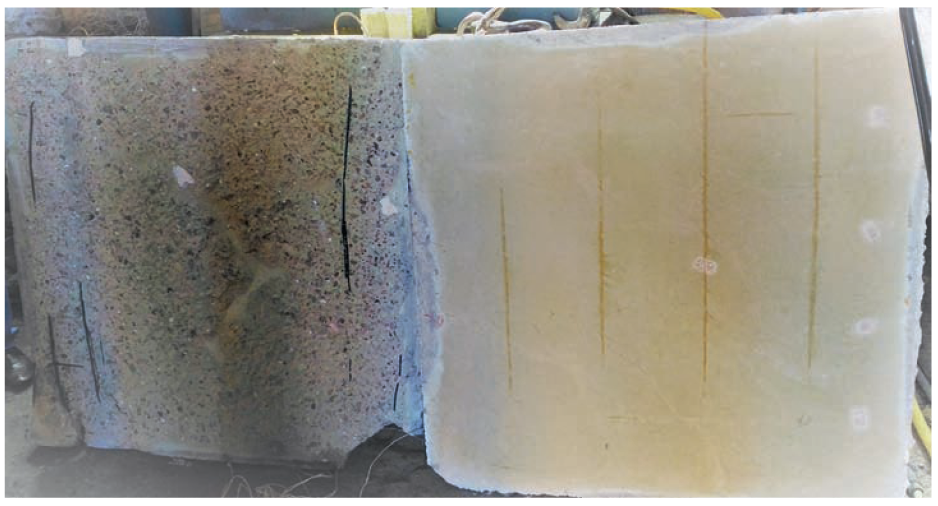 Рис. 11. Состояние обогреваемой поверхности плит без фибры (слева) ис фиброй (справа) после огневых испытаний