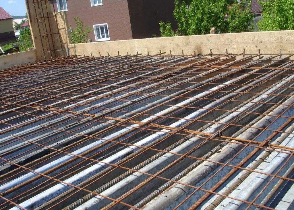 Наличие несъемной опалубки не обеспечивает плите дополнительную прочность, в то время как в процессе эксплуатации бетон находится под воздействием больших нагрузок как на изгиб, так и на сжатие. Чтобы избежать возможных осложнений, сооружают внутренний каркас из металлических прутьев, которые укладывают во впадины профлиста. Выполняют также «верхнее» армирование, уложив трубы по гребням листов Таким образом, из продольных и поперечных составляющих создается объемный арматурный каркас. Его элементы либо сваривают, либо соединяют стальной проволокой.