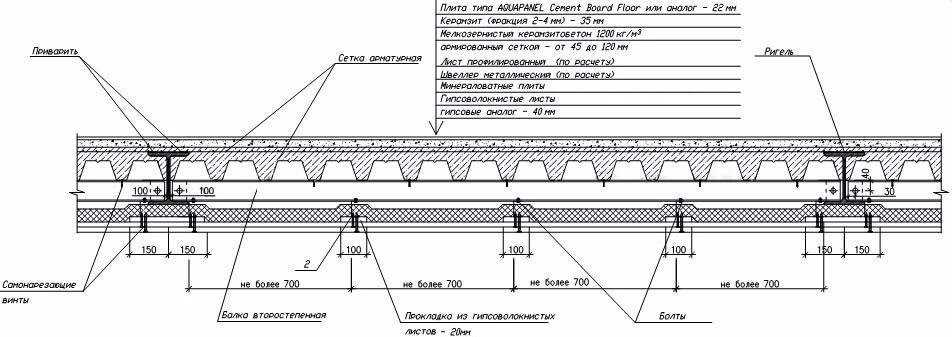 Исходя из эксплуатационной нагрузки определяют поперечное сечение балок. Железобетон и профлисты соединяют вертикальными стержневыми анкерами, что позволяет передать последним часть нагрузки. При этом для трехметрового пролета понадобится профлист толщиной не менее 0,9 мм.