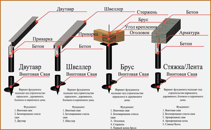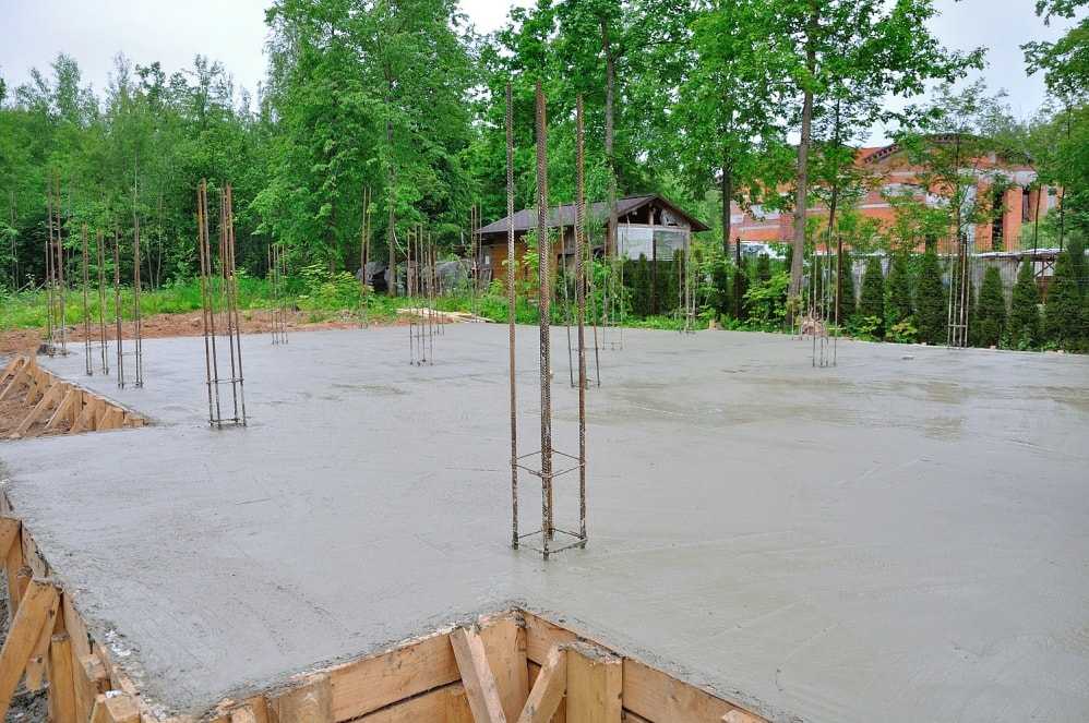 Основанием для бетонного дома может служить свайно-винтовой, плитный или ленточный фундамент. Предпочтение тому или иному варианту отдаётся в зависимости от следующих факторов: