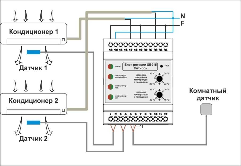 - 1. Подключаются все информаторы из наборов кондиционеров, плюс комнатный датчик, отвечающий за температуру. В этой ситуации блок ротации полностью контролирует процесс и работает в нормальном режиме. Стандартное переключение осуществляется через восемь часов. При этом второй аппарат, выполняющий функции резервного, включится и в экстремальных случаях. Например, внезапное отключение первого кондиционера или при резком повышении температурных показателей.
