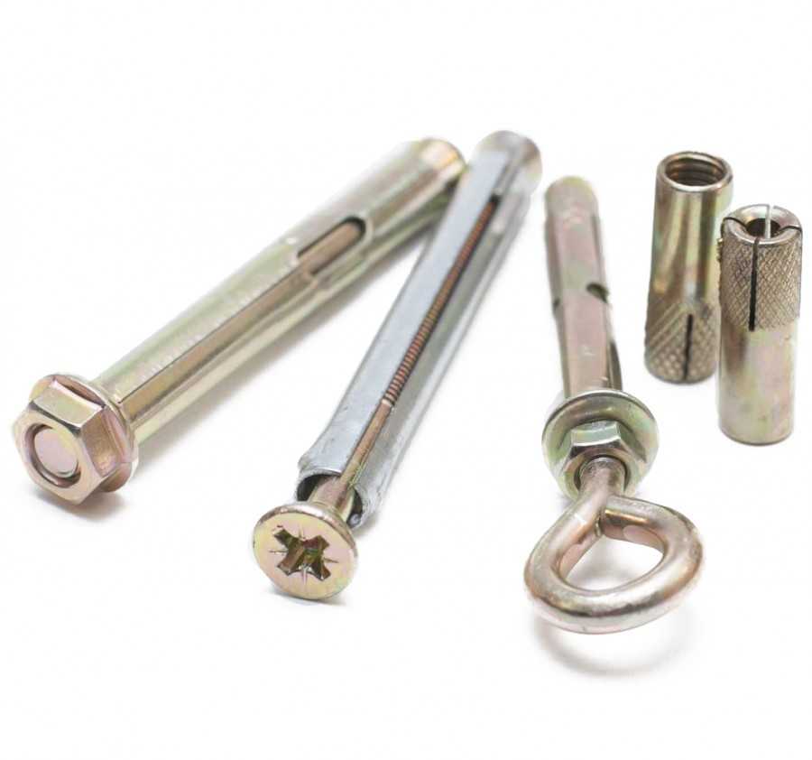 - цанговый болт распорного типа. Разжимной тип крепежных элементов представляет собой модернизированный вариант втулочного фиксатора, однако имеет более сложную конструкцию. Продольные разрезы на разжимной гильзе делят ее поверхность на четыре лепестка, которые под воздействием распорного элемента частично раскрываются, увеличивая размер поперечного сечения. Фиксация обеспечивается как за счет усилий, связанных с трением, так и за счет изменения формы рабочей поверхности. Нагрузочная способность разжимного элемента с цангой соответствует характеристикам клинового анкера. Отличие состоит в уменьшенном напряжении в зоне контакта с материалом. Изделие используется в полом кирпиче и легких видах бетонов. Повышенная стоимость анкера ограничивает его широкое применение;