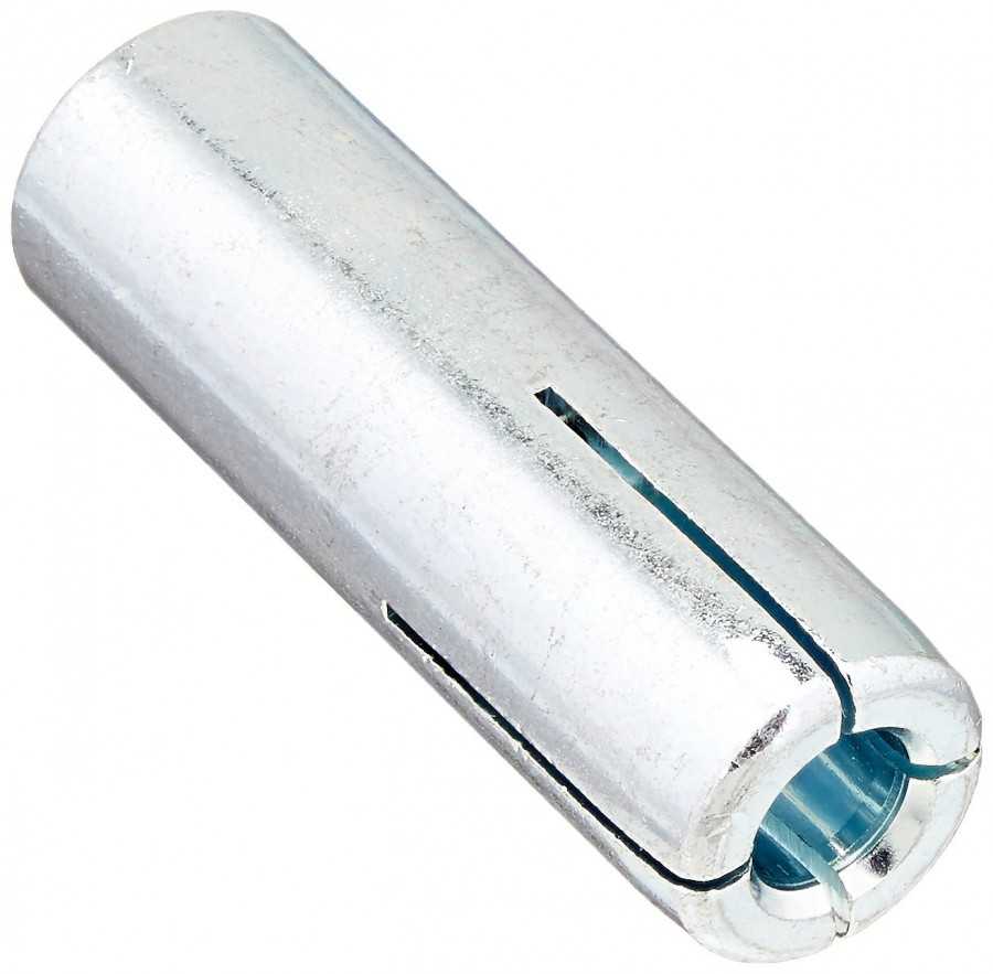 - втулочный анкер с гайкой. Анкеры металлические втулочного типа оснащены фиксирующей гильзой, длина которой равна размерам стального стержня. На хвостовой части шпильки выполнена клинообразная головка. При завинчивании гайки она смещается по резьбовой части. В результате перемещения происходит распирание втулки. Конструктивные особенности такого вида крепежа позволяют использовать его в легких видах бетонов с ячеистой структурой, а также в кирпиче, изготовленном из обожженной глины. Возможность применения в хрупких материалах связана с уменьшенной величиной напряжения, которое создает такой анкер внутри канала. К выполнению монтажных работ не предъявляются специальные требования, что позволяет производить сквозную установку. По сравнению с клиновым, втулочный фиксатор обладает уменьшенной нагрузочной способностью;