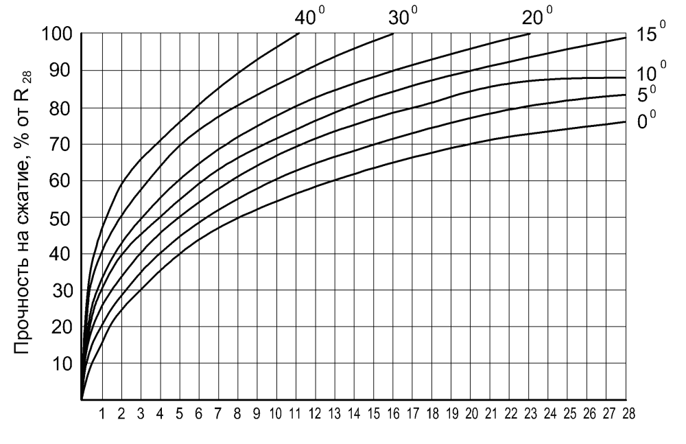 Рис. 6.1. Усредненные кривые набора прочности бетона В15-В25 на сжатие на портландцементе М400 — М500 по дням в зависимости от температуры выдерживания.
