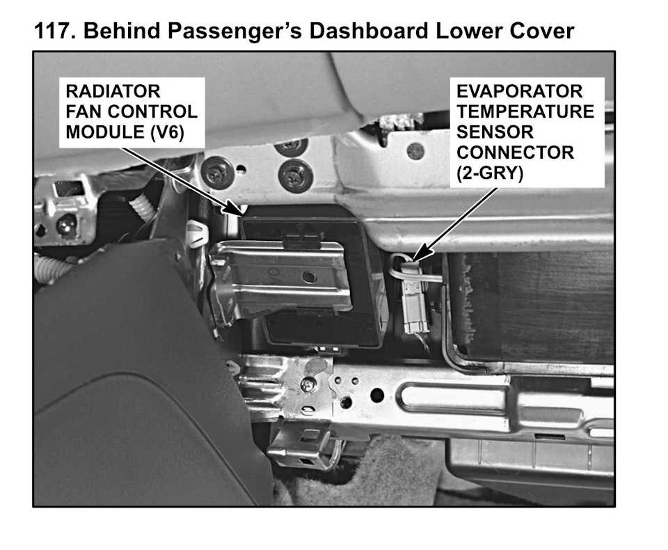 ДАТЧИК ТЕМПЕРАТУРЫ ИСПАРИТЕЛЯДатчик температуры испарителя представляет собой термистор NTC (с отрицательным температурным коэффициентом), передающий в модуль ATC (автоматического управления температурой) сигнал температуры воздуха на выходе из испарителя. Датчик температуры испарителя установлен в правой стороне корпуса отопителя и входит в радиатор испарителя.Модуль ATC (автоматического управления температурой) использует входной сигнал от датчика температуры испарителя, чтобы управлять включением и выключением муфты компрессора A/C (кондиционирования воздуха) для предотвращения образования льда на испарителе.