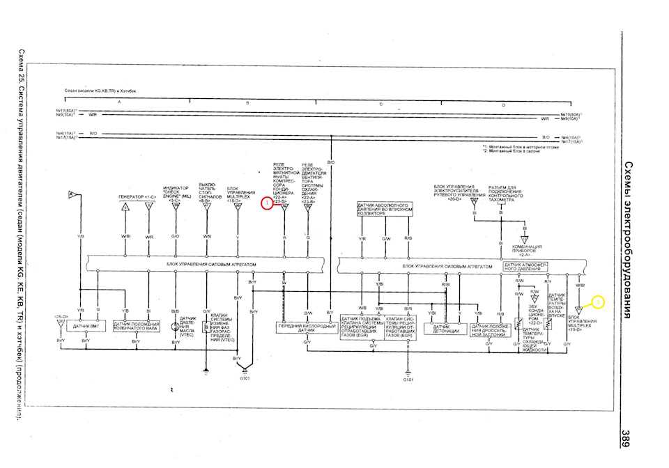 Под номером 1 (выделен красным цветом) — управляющий провод реле включения муфты кондиционера, управляюший сигнал выдает блок управления двигателем смотри сх№3-2