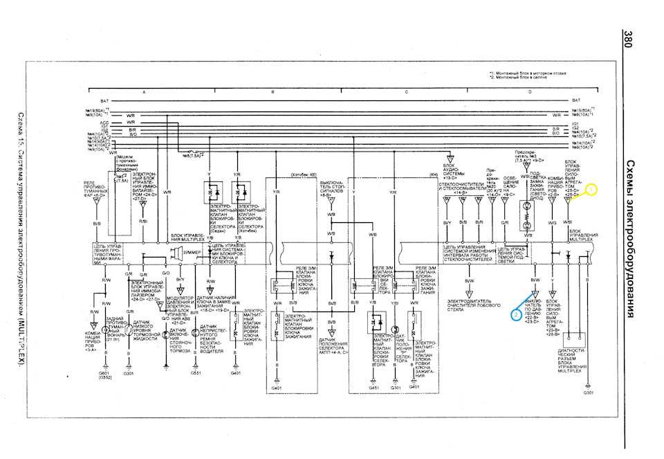 Под номером 2 (выделен синим) вход +12в с блока “кондиционер” смотри сх№1, также с мультиплексора смотри номер 3 (выделен желтым) отправляется в блок управления двигателем смотри сх№3-2.