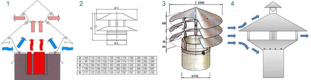 Многолопастный дефлектор-флюгер (поз. 1 и 2 на рис.) дает стабильную тягу на ветру до 9-10 баллов при незначительных нагрузках на трубу, поэтому его можно ставить на сэндвичевые, керамические и стеклянные дымоходы. Однолопастный дефлектор-флюгер на сильном ветру сильно нагружает трубу, поэтому она должна быть прочной и дом располагаться в месте, где штормовой ветер не разгуляется. Зато однолопастный дефлектор-флюгер несложно оформить в виде птицы (поз. 3 и 4).