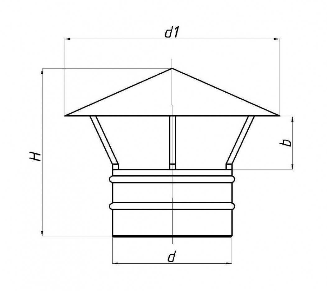 - Низ выполняется в форме основания, фиксирующегося к оголовку дымоходной трубы. В корпусе есть отверстия для метизов. В комплекте идут кровельные проходы под углом 15 – 35° по заказу покупателя.