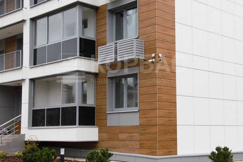 Облик здания преображается: наружные блоки оказываются закрытыми защитно-декоративными элементами, которые можно возводить в ниши или соединять между собой. Корзины, короба, экраны органично вписываются в дизайн дома, выгодно дополняют его. Можно выбрать оттенок, максимально соответствующий цвету фасада — тогда наружные блоки совсем не выделяются на фоне стены. Другой вариант — контрастные цвета. Если у фасада сдержанное цветовое решение, защитные элементы могут выступать в роли ярких акцентов. Доступны для заказа двухцветные модели.