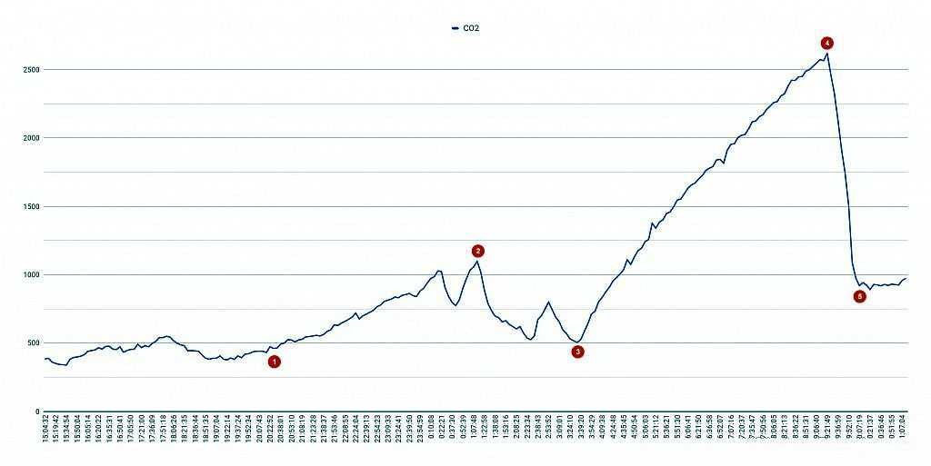 - Точка 4. 9-20 утра, человек проснулся. Уровень CO2 — 2600 ppm, что значительно ниже крайней нормы. Окно открыли, уровень углекислого газа менее чем за час вернулся к норме (Точка 5).