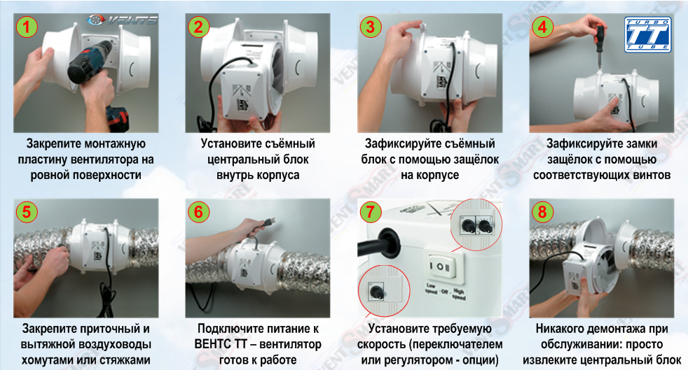 Сам вентилятор устанавливается после завершения отделки. Порядок установки такой: