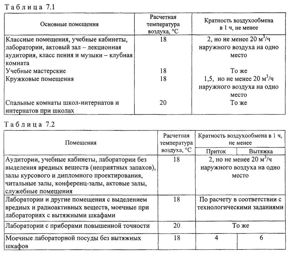 Некоторые из вышеперечисленных условий должны быть выполнены сегодня в соответствии с правилами. Требования к вентиляции учебных зданий определены в СНиП 41-01-2003, СНиП 31-06-2009 и СНиП II-65-73. Основными стандартами являются: